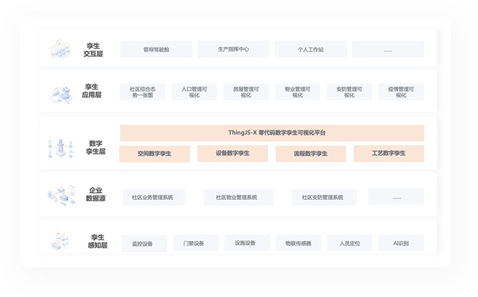 ThingJS-X零代码开发平台按照孪生体--孪生体集合--孪生场景--孪生业务的基本范式,通过组装孪生体数据、模型、界面和动作,可以满足各类智慧社区所需的数字孪生应用的需求
