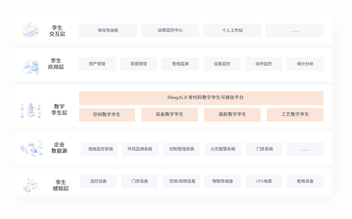 ThingJS-X零代码开发平台按照孪生体—孪生体集合—孪生场景—孪生业务的基本范式,通过组装孪生体数据、模型、界面和动作,可以满足各类智慧机房所需的数字孪生应用的需求。