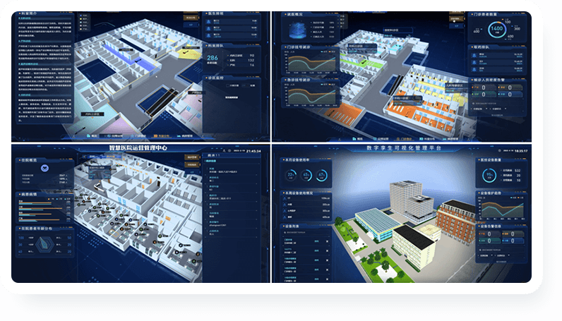 UINO优锘科技的合作伙伴利用ThingJS-X交付的智慧医院管理系统基于数字孪生的理念,创建虚拟数字孪生医院,实现对现实世界的全域感知、镜像再现,在数字孪生世界里对医院空间资源使用情况进行可视分析,实现对医院科室、病房、病床的空间资源和状态的有效管控,辅助医院管理决策。项目主要建设有16个可视化应用,分别是:医院介绍、日常运营、科室分布展示、门诊流量管理、人员管控、患者管理、排队情况展示、安全管控、住院病区管理、病房管理、病床管理、手术管理、物资管理、疫情管控、医疗设备管理和医疗废物管理。