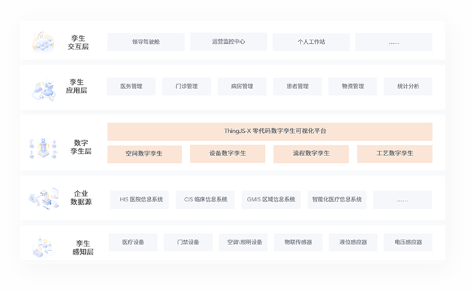 ThingJS-X零代码开发平台按照孪生体—孪生体集合—孪生场景—孪生业务的基本范式,通过组装孪生体数据、模型、界面和动作,可以满足各类智慧医院所需的数字孪生应用的需求。