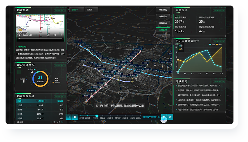 地铁概览无缝融合2D&3D可视化技术,全面展示了西安地铁线路分布走向、建设情况、里程统计、以及地铁文化和重要安保活动等,支持下钻到具体站点查看名称、“一站一景”文化墙、建筑、道路等信息。“西安建地铁忙坏了文物局”硬核历史让西安地铁建设备受全国人民关注,通过0代码平台ThingJS-X配置时间轴图层,以3D可视化的方式展现西安地铁特色发展史。
